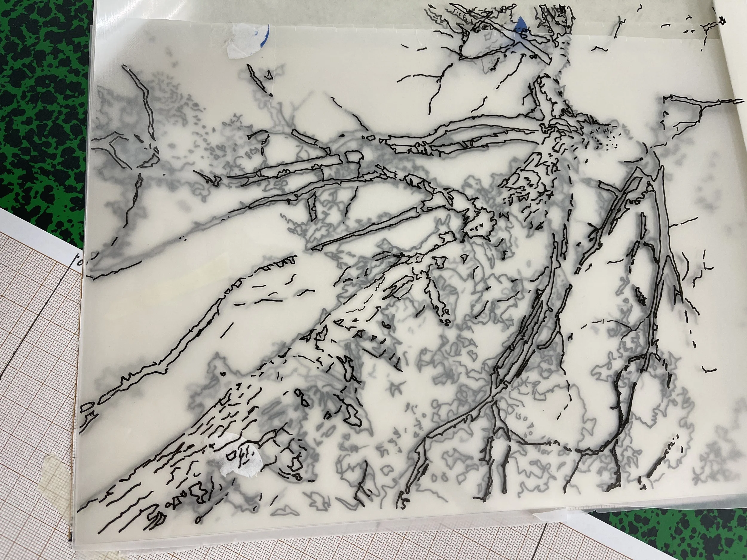 De switch naar papier ontstond in Noorwegen. Zodra ik de ruimte van deze schitterende artist-in-residence binnenstapte wist ik meteen dat op de oude doorleefde vloer werken met vilt onmogelijk was. Hij daagde uit om op te frotteren. Papier en grafiet werden zo het materiaal voor een serie werken in papier. Om dicht te blijven bij die unieke plek is er de bronfoto en worden coördinaten vastgelegd. De transitie van foto naar tekening begint met het opblazen van de foto. De afbeelding transformeert in een onderwaterwereld. Al kijkend naar de donkere en lichtere pixels trek ik lijnen en ontstaat er een sjabloon. De kwetsuren in de nerven van de vloer kwamen prachtig uit in de druktechniek, wat frotteren is. In sommige werken ga ik mee met de nerf. Dwars over frotteren benadrukt de kwetsuren in het hout. Papier biedt veel mogelijkheden dus keuzes. De achterkant is zachter en vangt het licht anders. Gescheurd papier creëert schaduwen, snijden een harde lijn. Sjablonen snij ik, papier wordt gescheurd. Papier leeft een eigen leven: in vochtige ruimtes krult het meer bij droogte krimpt het als het ware. De omgeving, het licht en de lucht maken mede het kunstwerk.